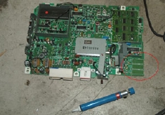 取り外したアンテナケーブルコネクター、画像だけみたら非常に簡単に取り外したように見えますが、実は固定にてあるハンダの剥離作業は私の持っいる低温ハンダでは剥離出来ずに、C.S_Oさんの高温ハンダと画像の下に写っているハンダ吸いをお借りして苦戦しながら取り外しました。