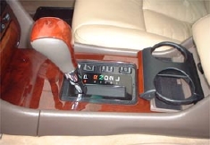 上からの画像、ウッドの色も差程違和感なく収まっているのがお判りいただけると思います。画像では判りにくいですがウッドのカット部分周囲は統べてブラックアウト処理し貼り付け後の周囲はフェルト加工してあるシート(画像のカップホルダー底に貼り付けてあるシート)を極細にカットして巻き付けてあります。