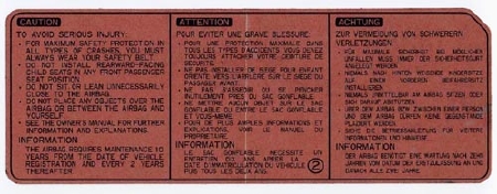 そして「10系は内装色でラベルの色を変えるほど凝ったつくりでしたが、どうも20系(前期のみ)にもラベル単品の設定があるようです。ただし、内装色に関係なく1種類です。名前もドライバー&パッセンジャーエアバックコーシヨンラベルなので、運転席と助手席に同じのをつけるようです」とのことで、「ヘッドライニングにつけるのか、サンバイザーにつけるのかわかりません。未確認なんですが、これならまだいけると思いますが、どうでしょう?」と提案いただき、こうなればなんでもいいやと思いオーダー、上の画像のなんともエキゾチックな色のコーションが手元に届きました。これが全ての内装色にマッチするのか少々疑問ではありますがその続きは後ほど、サイズは縦約80mm、横約220mmです。