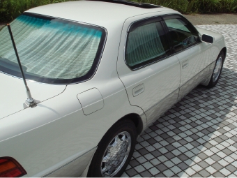 本来10系後期トリムNo-LE00(ベージュ)本皮シートとのガラスの組み合わせはブロンズで当時としてはカラーコ-ディネートされた組み合わせだったのですが、私はセルシオ購入当時からこのアイボリーにグリーンガラスを装着したくてたまりませんでした。今回はネットオークション等を利用しいて部品調達しましたがフロント&リアガラスは新品交換しました。交換後の感想は言うまでもなく大満足の一言です。10系ではアイボリー内装にグリーンガラスって見た事ないので一人優越感に浸っています。
