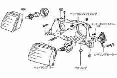 構成図を見る限りでは、ハウジングにエーミングギヤが付いているように見えるので、おそらくハウジングをレベリングあり用に交換すればいけるのではないかと思います。で、ハウジングの価格ですが以外と安く、とりあえず片側1個だけでも取り寄せて見たいと思います。これでうまくいけば、ヘッドランプを交換するより安く済みます。