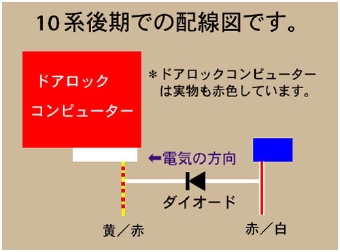 上記の説明分を簡単に下記に図にしてみました。10系前期は配線の色が異なります(ドアーコントロールリレーの18ピン乳白色コネクターの15番は前期が緑線で後期は黄・赤線になっています)が後期同様に出来るみたいです。準備物は、20cm程の配線10cmに切断して2本作成、あとは電気逆流防止ダイオード1コと枝割りした配線を止めるもの2コで準備オッケーです。